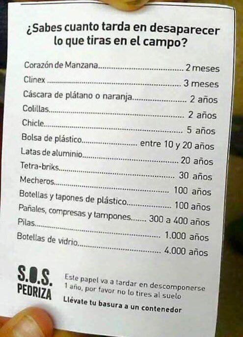 Estamos realmente concienciados de que no podemos tirar basuras al suelo, pues tardan muchíiiiiiiisimo tiempo en desaparecer y contaminan nuestro planeta...Mirad, mirad